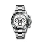 40mm polished 904L stainless steel case, screw-down back and push buttons, screw-down crown and push buttons with Triplock triple waterproofness, black monobloc ceramic Cerachrom bezel with engraved tachymetric scale, scratch-resistant sapphire crystal, white panda lacquer dial, 18K white gold applied applique hour markers with Chromalight, black snailed counters, automatic movement with chronograph central second hand, 30-minute counter at 3 o'clock, and 12-hour counter at 9 o'clock, approximately 72 hours of power reserve, 904L stainless steel Oyster bracelet with solid links, folding Oysterlock buckle with Easylink 5mm comfort extension link. Waterproof to 100 meters. The 116500 series was first introduced at the 2016 Baselworld Watch Fair.