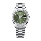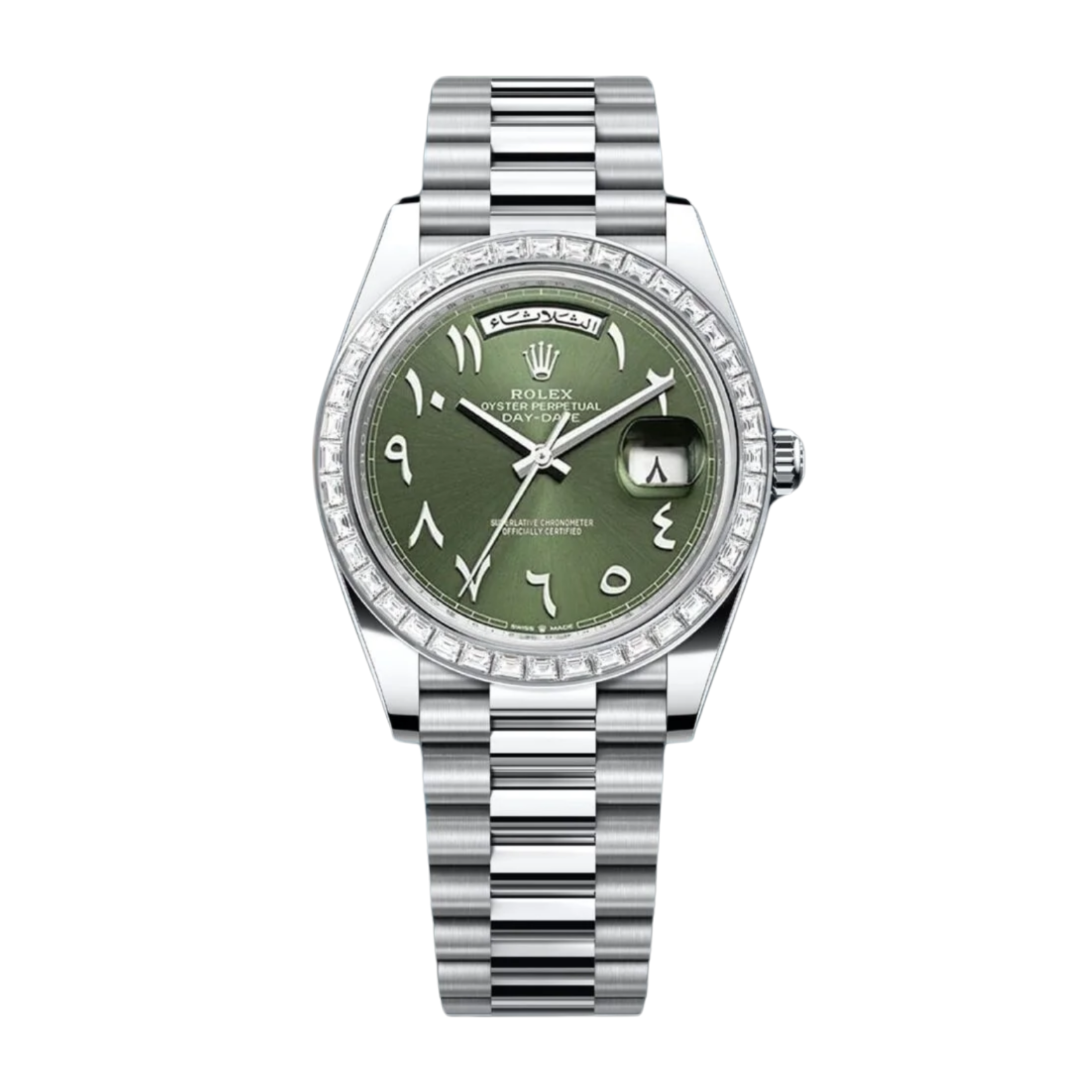 Rolex Platinum Day-Date 40 Watch - Diamond baguette Bezel - Olive Green Special Arabic Dial - President Bracelet - 228396TBR