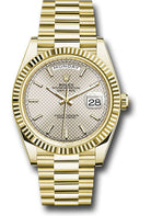 40mm 18K yellow gold case, screw-down back with Rolex fluting, screw-down crown with twinlock double waterproofness system, fluted bezel, scratch-resistant double anti-reflective sapphire crystal with cyclops lens over the date, silver diagonal motif dial, index hour markers with Chromalight, Rolex calibre 3255 automatic movement with centre hour, minute and seconds hands, instantaneous day and date in apertures, unrestricted rapid-setting, and stop-seconds for precise time setting, approximately 70 hours of power reserve, President bracelet with three-piece solid links comprised of a polished center link, satin-finished outer links, and ceramic inserts, concealed folding Crownclasp buckle. Waterproof to 100 meters.