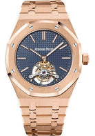 41mm x 8.85mm 18K pink gold case, sapphire crystal back, glareproofed sapphire crystal, blue dial with Petite Tapisserie pattern, pink gold applied hour-markers, and pink gold Royal Oak hands with luminescent coating , manual-winding Audemars Piguet Calibre 2924 movement with tourbillon and power reserve on back, approximately 70 hours of power reserve, 18K pink gold bracelet. Water resistant to 50 meters.