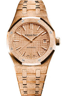 37 mm hammered 18K pink gold case, 9.8 mm thick, sapphire crystal back, screw-locked crown, pink gold-toned dial with Grande Tapisserie pattern, pink gold applied hour-markers and Royal Oak hands with luminescent coating, Manufacture Calibre 3120 selfwinding movement with hours, minutes, centre seconds and date, approximately 60 hours of power reserve, hammered 18K pink gold bracelet, AP folding buckle. Water resistant to 50 m.