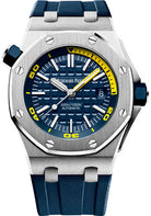 42 mm stainless steel case, 14.1 mm thick, glareproofed sapphire crystal back, blue rubber-clad screw-locked crown, glareproofed sapphire crystal, blue dial with Mega Tapisserie” pattern, white gold applied hour-markers and Royal Oak hands (yellow minutes hand) with luminescent coating, blue rotating inner bezel with diving scale and zone from 60 to 15 minutes in yellow, Calibre 3120 selfwinding movement with dive-time measurement, hours, minutes, center seconds and date, approximately 60 hours of power reserve, blue rubber strap and additional yellow rubber strap, stainless steel pin buckle. Water resistant to 300 meters.