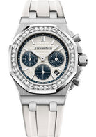 37 mm stainless steel case, 12.4 mm thick, screw-locked crown, diamond-set bezel, silver-toned dial with Lady Tapisserie pattern, blue counters, blue external zone, white gold applied hour-markers and Royal Oak hands with luminescent coating, Calibre 2385 selfwinding movement with chronograph, hours, minutes, small seconds and date, approximately 40 hours of power reserve, white rubber strap, stainless steel AP folding buckle , comes with additional blue rubber strap. Water resistant to 50 m.