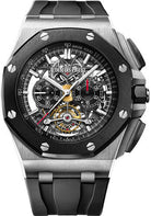 44 mm titanium case, 14.45 mm thick, glareproofed sapphire crystal back, screw-locked crown and titanium pushpiece guards, black ceramic bezel, glareproofed sapphire crystal, satin-brushed black openworked dial with black counters, white gold applied hour-markers and Royal Oak hands with luminescent coating, black Inner bezel, Calibre 2936 hand-wound movement with tourbillon, chronograph, hours, minutes, small seconds, approximately 72 hours of power reserve, black rubber strap, titanium pin buckle. Water resistant to 100 meters.