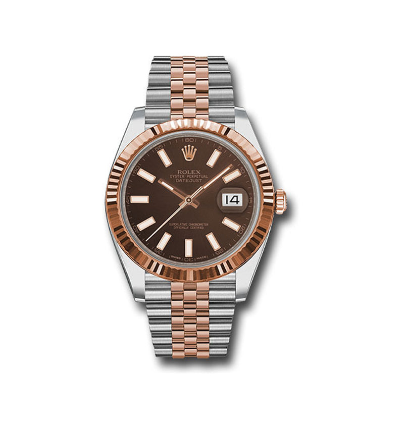 41mm Everose Rolesor case with 904L steel monobloc middle case, screw-down steel back, 18K Everose gold screw-down crown, 18K Everose gold fluted bezel, scratch-resistant double anti-reflective sapphire crystal with cyclops lens over the date, chocolate dial, index hour markers, Rolex calibre 3235 perpetual self-winding movement with date at 3 o'clock that changes instantaneously at midnight in a few thousandths of a second, approximately 70 hours of power reserve, Everose Rolesor Jubilee bracelet made from a combination of 904L steel and 18K Everose gold with five-piece links, folding Oysterclasp buckle with Easylink 5mm comfort extension link. Waterproof to 100 meters.