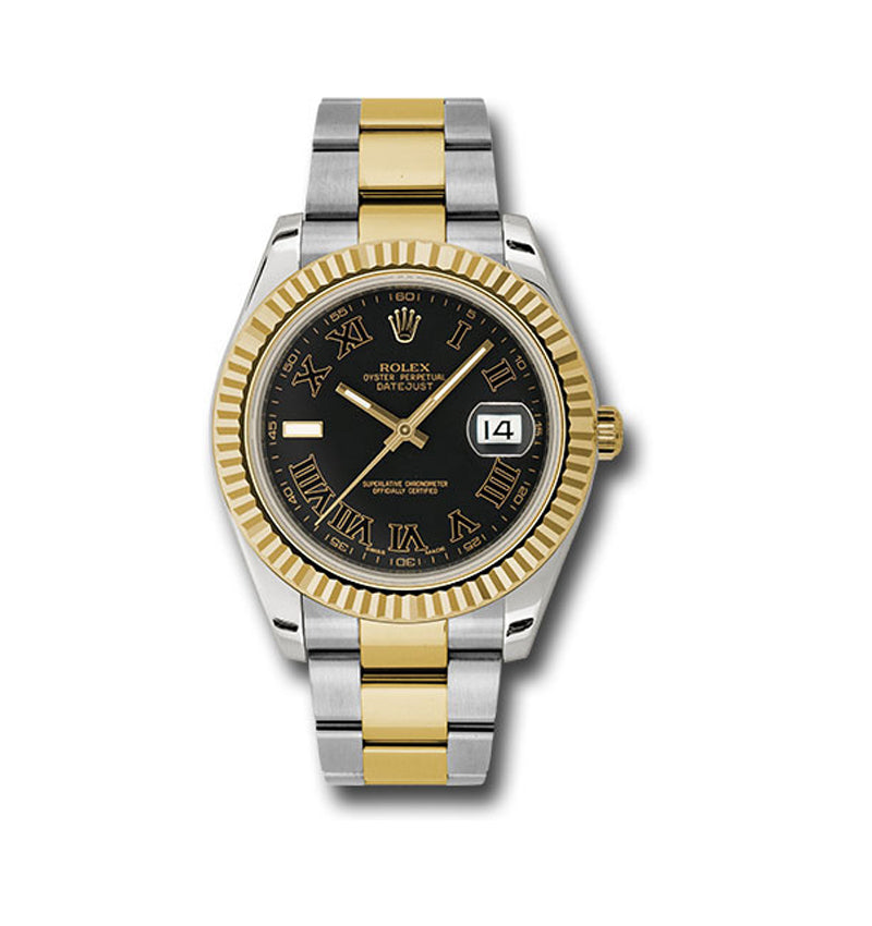 This watch is a 41mm Rolesor case in a beautiful stainless steel with 18K yellow gold fluted bezel, black dial, black and gold Roman numerals with index marker at 9 o'clock, and stainless steel and 18K yellow gold Oyster bracelet with Oysterclasp and Easylink extension link. Also, this watch is water resistant up to 100 meters.