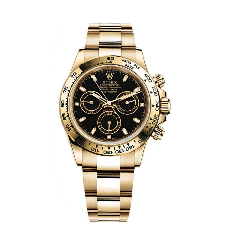 This watch is a 40mm in a beautiful 18K yellow gold case screw-down back, screw-down crown and push buttons with Triplock triple waterproofness. Fixed 18K yellow gold bezel with engraved tachymetric scale, scratch-resistant sapphire crystal with black dial, index hour markers, Rolex calibre 4130 self-winding movement with chronograph central second hand, 30-minute counter at 3 o'clock, and 12-hour counter at 9 o'clock, approximately 72 hours of power reserve, 18K yellow gold Oyster bracelet with flat three-piece links, folding Oysterlock buckle with Easylink 5mm comfort extension link. Also, this is Waterproof up to 100 meters.