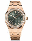 Diamond-set bezel of this 37 mm Royal Oak Selfwinding in 18kt rose gold opens onto a new khaki Grande Tapisserie dial. The watch also showcases the collection’s new design evolution. 18kt rose gold case, bezel set with brilliant-cut diamonds, glareproofed sapphire crystal and caseback. Khaki green dial with “Grande Tapisserie” pattern, rose gold applied hour-markers and Royal Oak hands with luminescent coating.18-carat pink gold bracelet with AP folding clasp