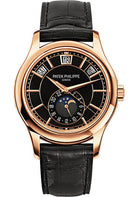 40mm 18K rose gold case, sapphire crystal back, black lacquered dial with gold applied numerals, self-winding Caliber 324 S QA LU 24H movement with annual calendar, day, date, month in apertures, moon phases and 24-hour dial, sweep seconds hand, approximately 35-45 hours of power reserve, hand-stitched shiny black alligator strap, prong buckle. Water resistant to 30 meters.