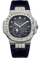 40mm 18K white gold case set with diamonds, sapphire crystal back, screw-down crown, black dial with gold applied hour markers with luminescent coating, self-winding caliber 240 PS IRM C LU movement with power reserve, date by hand, moon phases, seconds subdial, approximately 48 hour of power reserve, leather strap with Nautilus fold-over buckle. Water resistant to 120 meters.