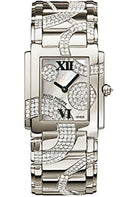 25mm x 30mm 18K white gold case set with diamonds, diamond set crown, mother of pearl and diamond paved dial, quartz caliber E 15 movement, diamond set 18K white gold bracelet. Water resistant to 30 meters.