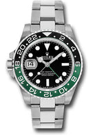 Two-Colour Green And Black Cerachrom Insert In Ceramic, Moulded Numerals And Graduations Bezel - Black Dial - Oyster Bracelet. 40mm Oystersteel case, screw-down back, screw-down crown with triplock triple waterproofness system, bidirectional rotatable 24-hour graduated bezel. two-colour green and black cerachrom insert in ceramic, moulded numerals and graduations bezel, scratch-resistant sapphire crystal with cyclops lens over the date, black dial, Rolex calibre 3285 perpetual self-winding, gmt function movement with centre hour, minute and seconds hands, 24-hour display, second time zone with independent rapid-setting of the hour hand, instantaneous date, and stop-seconds for precise time setting, approximately 70 hours of power reserve, Oyster bracelet with flat three-piece links, folding Oysterlock safety buckle with Easylink 5mm comfort extension link. Waterproof to 100 metres / 330 feet.
