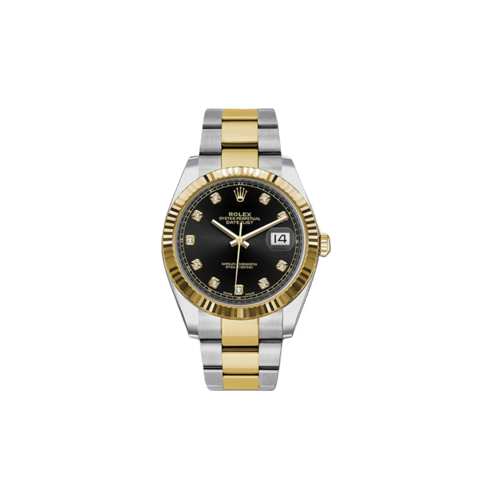 41mm Yellow Rolesor case with 904L steel monobloc middle case, screw-down steel back, 18K yellow gold screw-down crown, 18K yellow gold fluted bezel, scratch-resistant double anti-reflective sapphire crystal with cyclops lens over the date, black dial, diamond hour markers, Rolex calibre 3235 perpetual self-winding movement with date at 3 o'clock that changes instantaneously at midnight in a few thousandths of a second, approximately 70 hours of power reserve, yellow Rolesor Oyster bracelet made from a combination of 904L steel and 18K yellow gold with flat three-piece links, folding Oysterclasp buckle with Easylink 5mm comfort extension link. Waterproof to 100 meters.