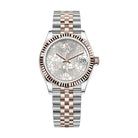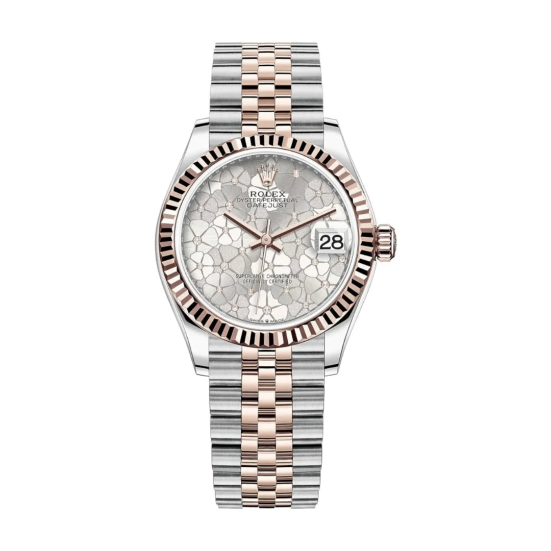 31mm Everose Rolesor case comprised of Oystersteel and Everose gold, screw-down back, screw-down crown with twinlock double waterproofness system, fluted bezel, scratch-resistant sapphire crystal with cyclops lens over the date, silver floral motif dial set with 24 diamonds, Rolex calibre 2236 perpetual self-winding movement with centre hour, minute and seconds hands, instantaneous date with rapid setting, and stop-seconds for precise time setting, approximately 55 hours of power reserve, Jubilee bracelet with five-piece links, concealed folding Crownclasp buckle. Waterproof to 100 metres / 330 feet