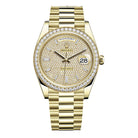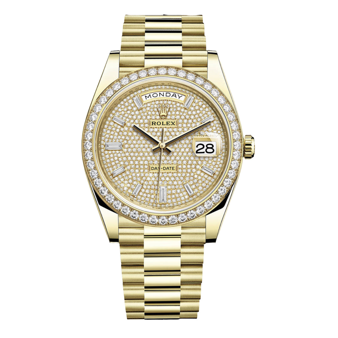 40mm 18K yellow gold case, screw-down back, diamond bezel, scratch-resistant sapphire crystal with cyclops lens over the date, diamond-paved dial, 10 baguette-cut hour markers, Rolex calibre 3255 perpetual self-winding movement with centre hour, minute and seconds hands, instantaneous day and date in apertures, unrestricted rapid-setting, and stop-seconds for precise time setting, approximately 70 hours of power reserve, President bracelet with semi-circular three-piece links, concealed folding Crownclasp buckle. Waterproof to 100 meters / 330 feet.