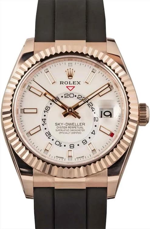 42mm 18k Everose gold case screw-down back, screw-down crown with twinlock double waterproofness system, fluted bezel, scratch-resistant sapphire crystal with cyclops lens over the date, white dial, index hour markers, Rolex calibre 9001 automatic movement with 24-hour display on off-centre disc, second time zone, instantaneous annual calendar at 3 o'clock and rapid-setting of the date, month display via 12 apertures around the circumference of the dial, stop-seconds for precise time setting, approximately 72 hours of power reserve, Oysterflex bracelet made from flexible metal blades overmoulded with high-performance elastomer, folding Oysterclasp buckle with glidelock extension system. Waterproof to 100 meters.