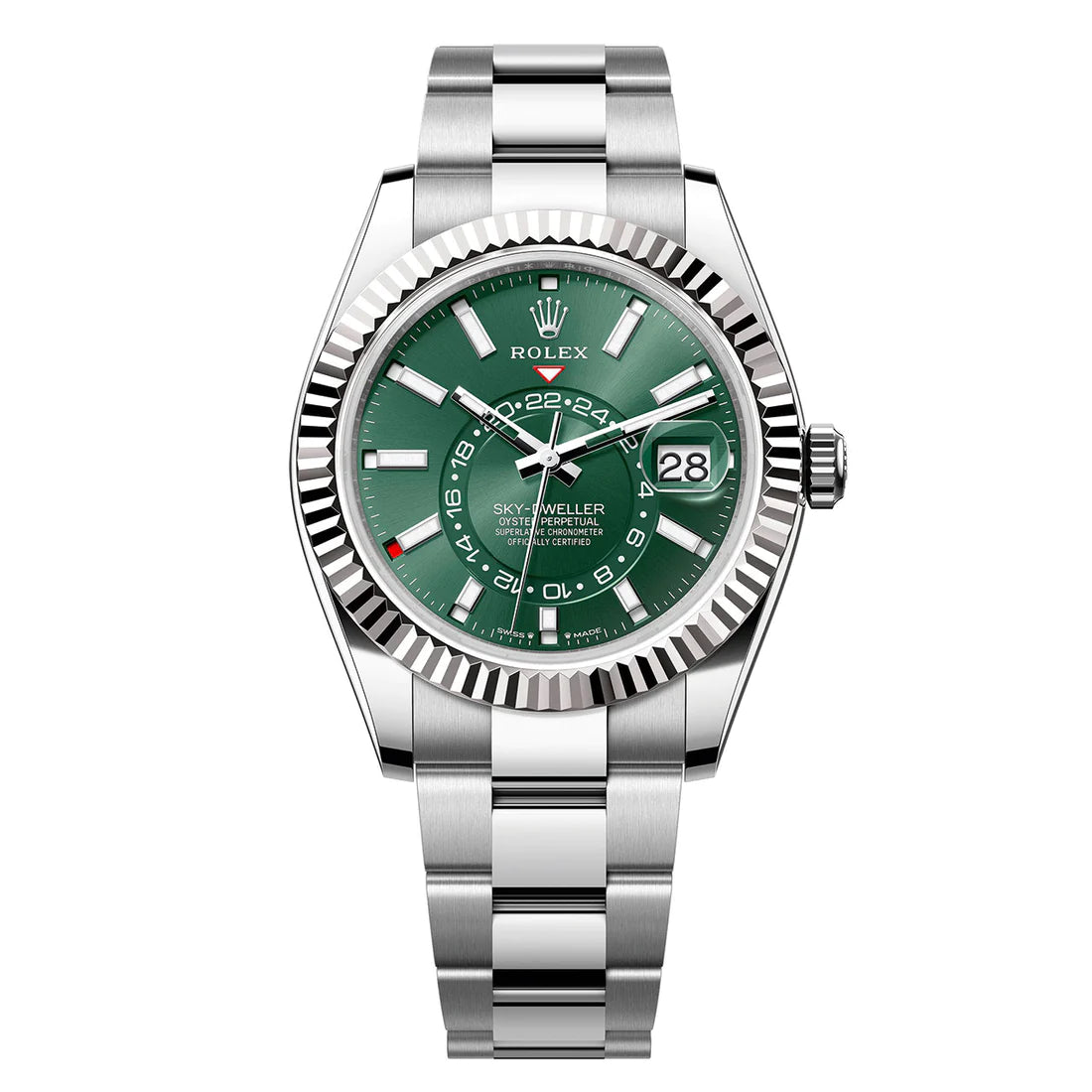 Rolex Sky-Dweller 336934-0001 is an exquisite timepiece hat offers a perfect blend of luxury, performance and style. Boasting a classic 42mm stainless steel case and an 18k white gold fluted bezel, this watch ensures you stand out from the crowd. The mint green dial with index hour markers adds a touch of sophistication to this watch, while the GMT second time zone and annual calendar features add to its practicality. The Oyster bracelet with Oysterclasp closure fits perfectly around your wrist for all-day comfort and elegance. Powered by Automatic Chronometer movement, this watch is sure to keep up with your fast paced lifestyle