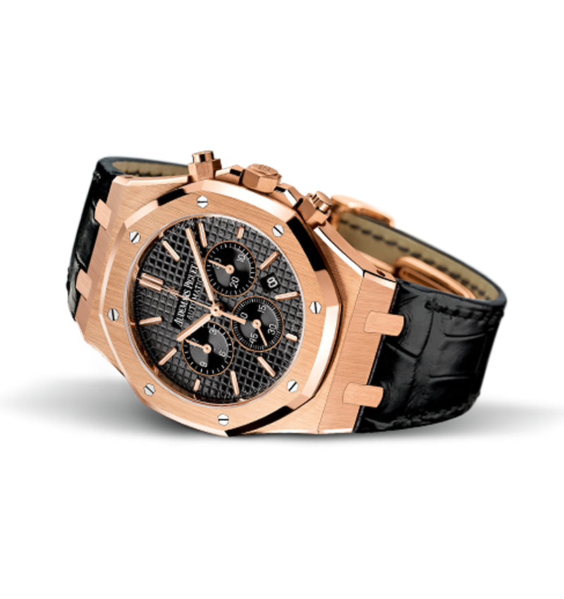 This watch is a 41mm x 10.80mm in a beautiful 18K pink gold case, screw-locked crown, glare-proofed sapphire crystal on a lovely black dial with Grande Tapisserie pattern, pink gold applied hour-markers, and pink gold Royal Oak hands with luminescent coating, self-winding Audemars Piguet Calibre 2385 movement with chronograph, date, and small seconds, approximately 40 hours of power reserve, hand-stitched large square scale black crocodile strap with 18K pink gold folding buckle. Also, this watch is water resistant up to 50 meters.