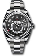 Is a 42mm in a beautiful 18K white gold case, screw-down back, screw-down crown, fluted bezel with bidirectional rotatable Rolex Ring Command, scratch-resistant sapphire crystal with cyclops lens over the date and double anti-reflective coating, black dial, Rolex calibre 9001 automatic movement, second time-zone displayed via off-center rotating disc, Saros annual calendar with date at 3 o'clock and month indicated in discrete apertures at each of the 12 hour marks, 18K white gold Oyster bracelet with flat three-piece links, folding Oyster clasp buckle with Easylink 5mm comfort extension link. Also, is Waterproof up to 100 meters.