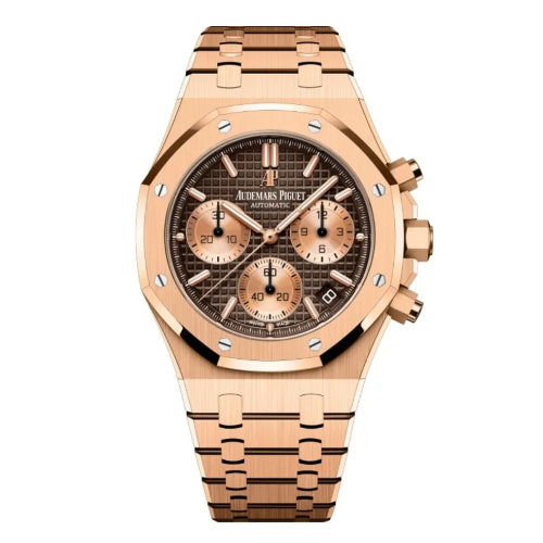 41mm 18K rose gold case, 11mm thick, screw-locked crown, glare proof sapphire crystal, brown dial with Grande Tapisserie” pattern, pink gold-toned counters, pink gold applied hour-markers and Royal Oak hands with luminescent coating, Calibre 2385 selfwinding movement with chronograph, hours, minutes, small seconds, date, approximately 40 hours of power reserve, 18K pink gold bracelet, AP folding buckle. Water resistant to 50 meters. Basic Info Reference number 26331OR.OO.1220OR.02 Brand Audemars Piguet Model Royal Oak Chronograph Caliber Movement Automatic Movement/Caliber 2385 Power reserve 40 h Number of jewels 37 Case Case diameter 41 mm Water resistance 5 ATM Dial Brown Bracelet/strap Bracelet material Rose Gold Clasp material Clasp Fold clasp