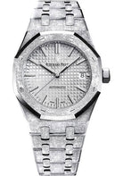 37 mm hammered 18K white gold case, 9.8 mm thick, sapphire crystal back, rhodium-toned dial with Grande Tapisserie pattern, white gold applied hour-markers and Royal Oak hands with luminescent coating, Manufacture Calibre 3120 selfwinding movement with hours, minutes, centre seconds and date, approximately 60 hours of power reserve, hammered 18K white gold bracelet, AP folding buckle. Water resistant to 50 m.