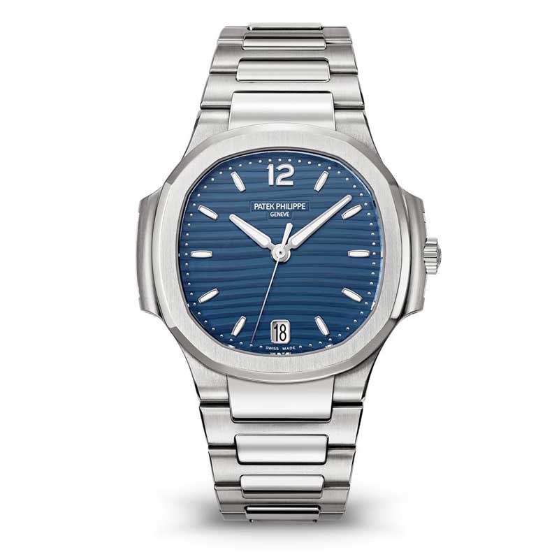 The 7118/1A - Ladies Nautilus is a stunning stainless steel watch with a 35.2 mm case, a sapphire crystal back, a blue opaline dial with gold-applied hour markers, and numerals that glow in the dark. A caliber 324 S C self-winding movement with a date window, a center sweep second hand, and a stainless steel bracelet with a fold-over buckle. The watch also is water-resistant up to 60 m.